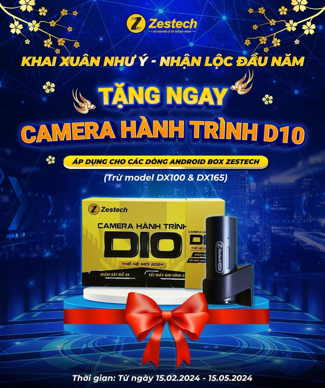 Chương trình bắt đầu: Từ ngày 15/02/2024 - 15/05/2024, khi quý khách mua các dòng sản phẩm Android Box Zestech (trừ model DX100 & DX165) sẽ được TẶNG CAMERA HÀNH TRÌNH D10.